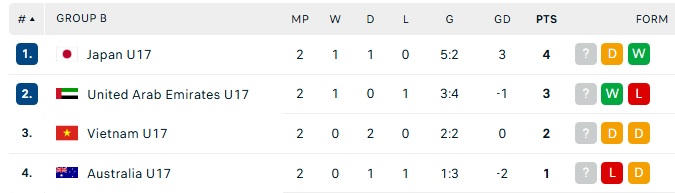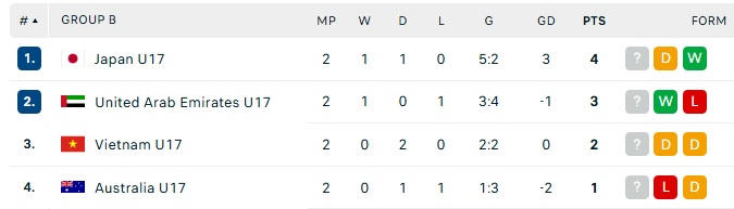 Căn cứ vào bảng xếp hạng hiện tại, U17 Việt Nam chỉ có con đường duy nhất là thắng U17 UAE để giành quyền đi tiếp. Còn trận cuối, U17 Việt Nam hoà và thua thì chắc chắn bị loại.