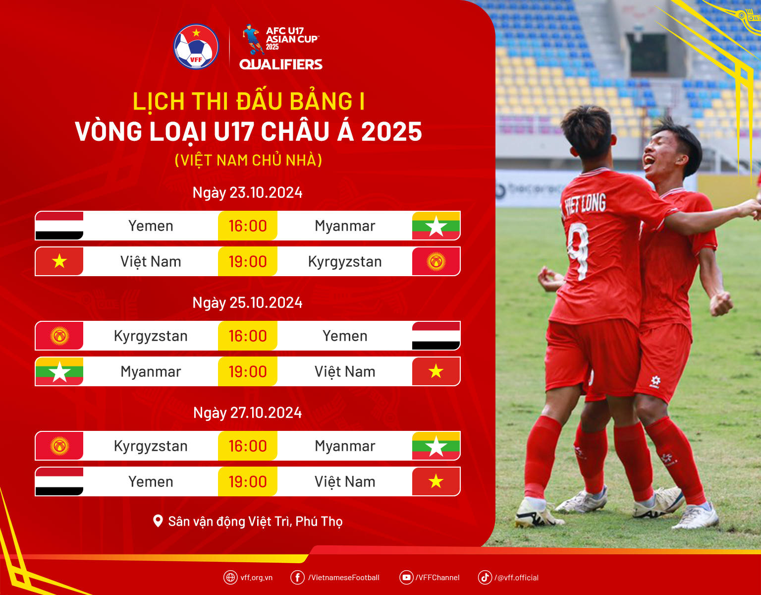Đội tuyển U17 Việt Nam sẽ đóng vai trò chủ nhà bảng I, diễn ra trên sân Việt Trì, Phú Thọ từ ngày 23/10 đến 27/10/2024. Thầy trò HLV Roland Cristiano sẽ lần lượt tiếp đón các đối thủ U17 Kyrgyzstan (ngày 23/10), U17 Myanmar (25/10) và U17 Yemen (27/10).