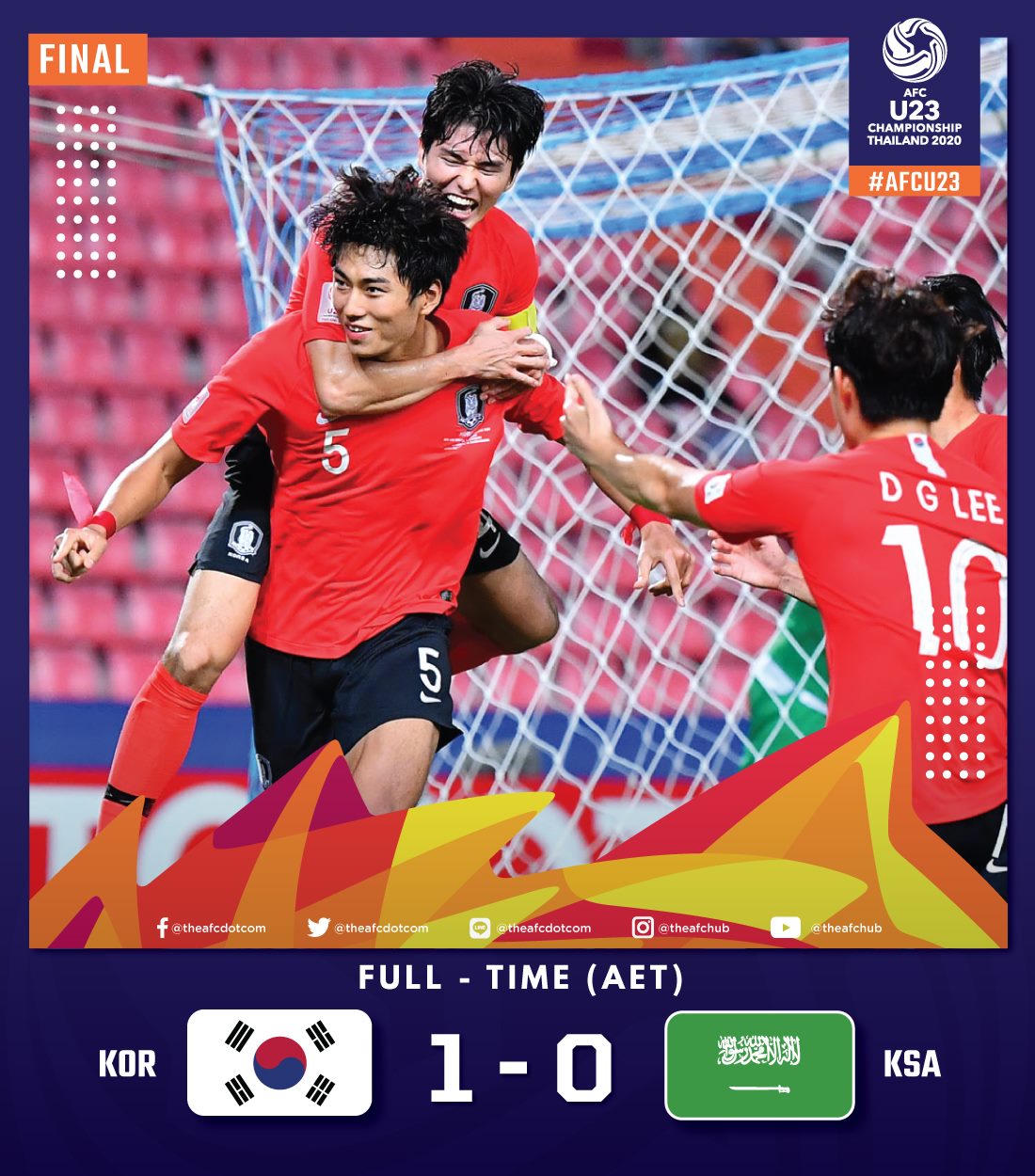 Không thể ghi bàn trong 90 phút thi đấu chính thức, hai đội đành kéo nhau vào 2 hiệp phụ. Những tưởng trận đấu sẽ phải giải quyết bằng loạt luân lưu thì phút thứ 113, trung vệ Jeong Tae-wook đã bật cao đánh đầu từ khoảng cách 5 mét hạ gục thủ môn Al Yami.