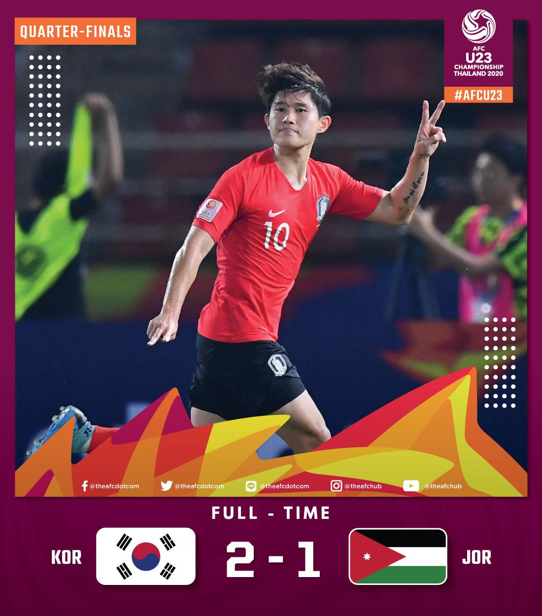 Thắng sát nút 2-1 đúng ở giây cuối cùng trận đấu, các cầu thủ U23 Hàn Quốc lẫn CĐV đội bóng này đã òa khóc. Họ đã tiến vào vòng bán kết, tức là chỉ còn cách tấm vé dự Olympic đúng 1 chiến thắng nữa.