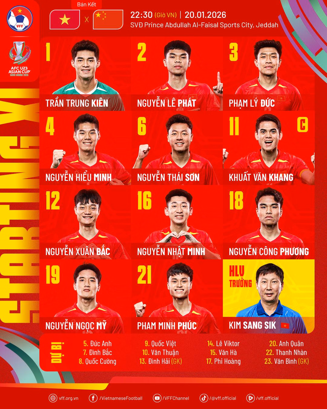 U23 Việt Nam mặc trang phục màu đỏ truyền thống, U23 Trung Quốc mặc áo màu trắng.