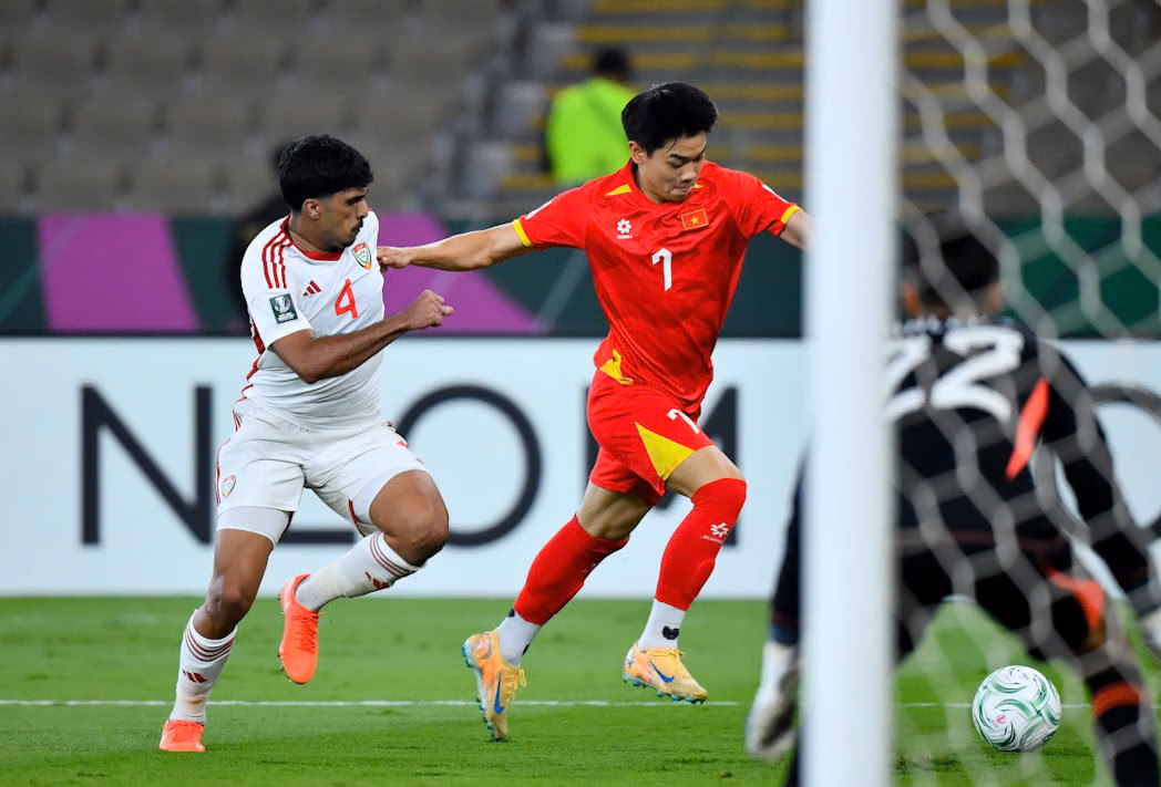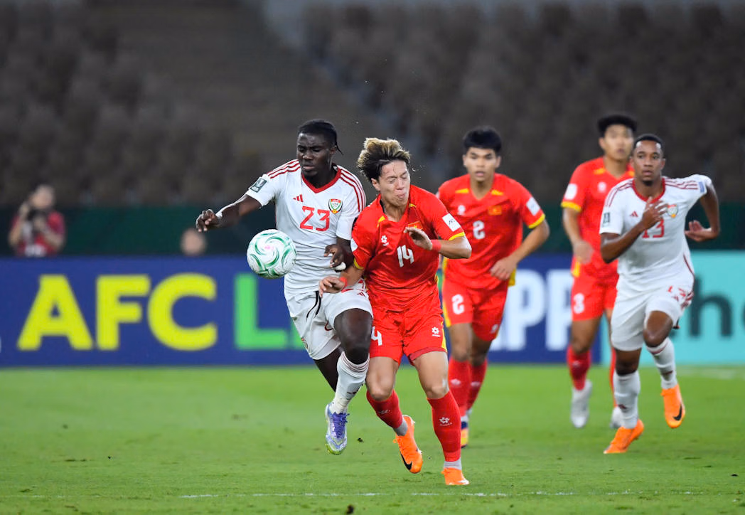 UAE chơi thấp, chủ động nhường thế trận và chờ thời cơ phản công. Phút 16, Saeed Almenhali dứt điểm vào lưới Trung Kiên từ một đường chuyền dài, nhưng bàn thắng không được công nhận sau khi VAR xác định cầu thủ số 10 để bóng chạm tay.