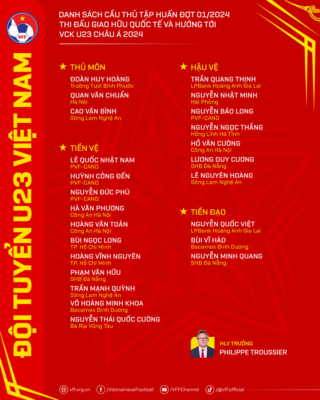 Tổng cộng 24 cầu thủ đã được HLV Philippe Troussier trao cơ hội trong đợt hội quân này, trong đó có những cái tên nổi bật như thủ môn Quan Văn Chuẩn, hậu vệ Trần Quang Thịnh, Nguyễn Ngọc Thắng, Lương Duy Cương, tiền vệ Lê Quốc Nhật Nam, Hoàng Văn Toản, Võ Hoàng Minh Khoa, tiền đạo Nguyễn Quốc Việt…