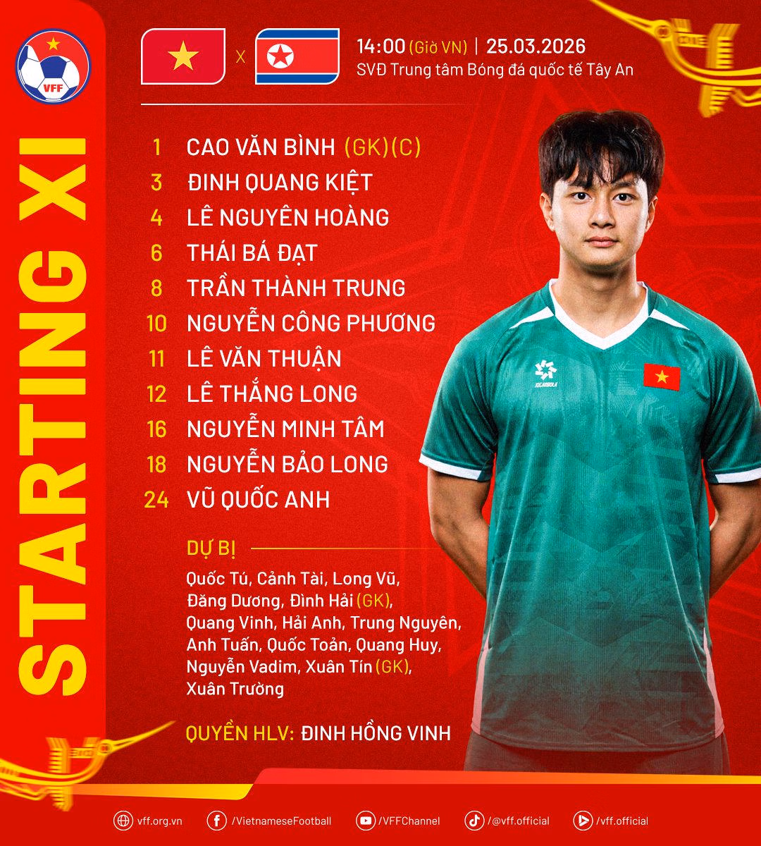 Chiều 25/3, đội tuyển U23 Việt Nam bước vào trận đấu mở màn Giải bóng đá quốc tế CFA Team China – Tây An 2026 gặp U23 CHDCND Triều Tiên. Dù sớm vươn lên dẫn trước ngay từ những phút đầu, thầy trò Quyền HLV trưởng Đinh Hồng Vinh đã phải chia điểm sau trận hòa 1-1 trước đối thủ được đánh giá có nền tảng thể lực và lối chơi giàu sức mạnh.