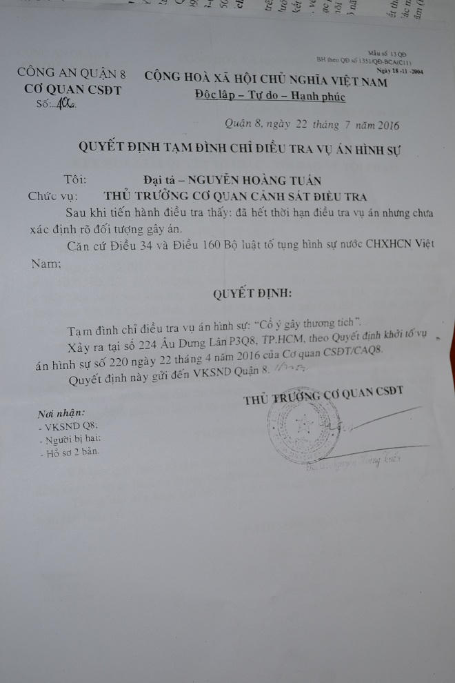Làm đơn gửi đến PLVN, anh Nguyễn Ngọc Đa (SN 1975, ngụ đường Tạ Quang Bửu, phường 3, quận 8, TP HCM) cho rằng bức xúc với quyết định tạm đình chỉ vụ án ngày 22/7/2016 của công an quận 8.