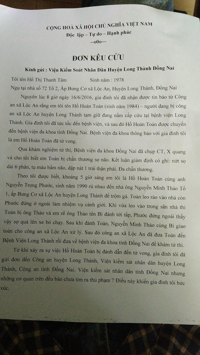 (PLO) - Gia đình chị Hồ Thị Thanh Tâm (SN 1978, ngụ ấp Bưng Cơ, xã Lộc An, huyện Long Thành, tỉnh Đồng Nai) có đơn cầu cứu khắp các cơ quan chức năng về cái chết của em trai mình là anh Hồ Hoàn Toàn (SN 1984). Anh Toàn rời nhà và sau đó vài giờ, người nhà nhận được tin báo anh nhập viện cấp cứu trong tình trạng không cứu chữa được.