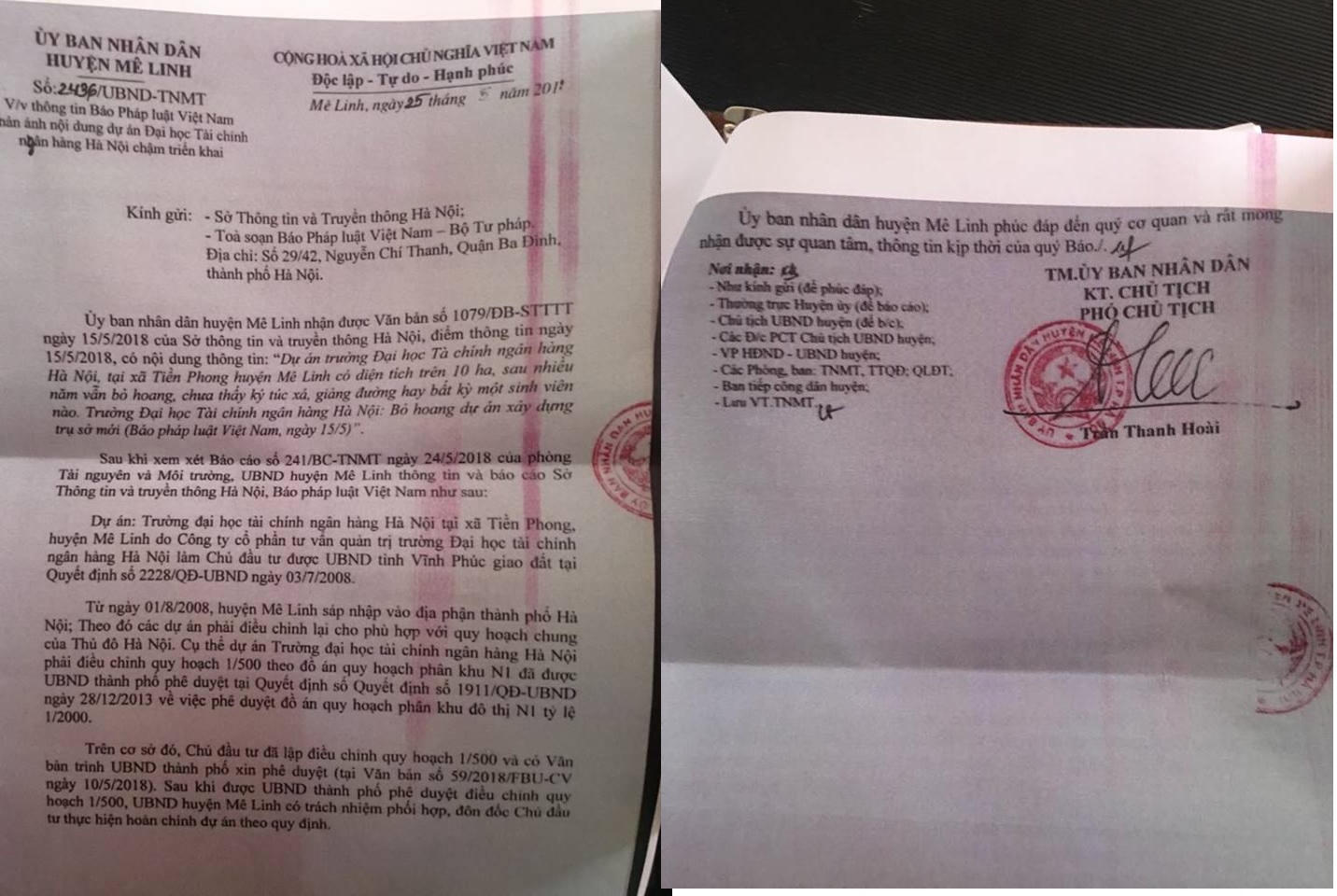 (PLO) - Sau khi báo PLVN điện tử phản ánh thông tin trường Đại học Tài chính Ngân hàng Hà Nội bỏ hoang trụ sở mới tại địa bàn xã Tiền Phong, huyện Mê Linh, Hà Nội, UBND huyện Mê Linh đã có văn bản phúc đáp lại báo PLVN về nội dung trên.