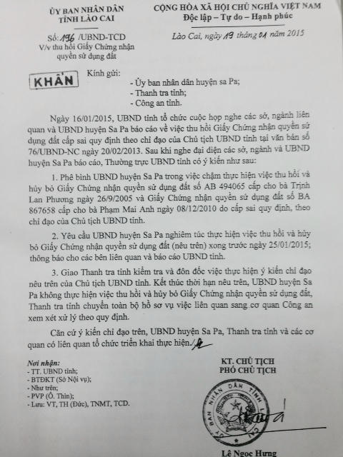Sau nhiều năm, ngày 19/1/2015, Phó Chủ tịch UBND tỉnh Lào Cai – ông Lê Ngọc Hưng đã ký văn bản khẩn, yêu cầu nếu hết ngày 25/1/2015, UBND huyện Sa Pa không thực hiện việc thu hồi và hủy bỏ Giấy chứng nhận quyền sử dụng đất cấp sai sẽ chuyển toàn bộ hồ sơ vụ việc sang cơ quan Công an xử lý theo quy định.