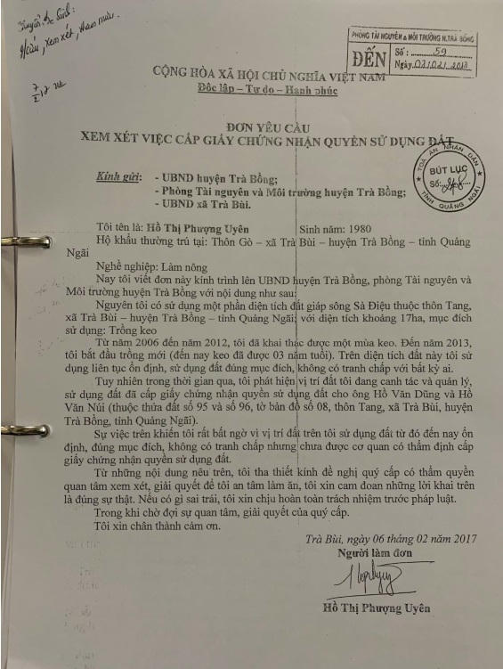 Bởi sự tắc trách của cơ quan có thẩm quyền khi chưa tiến hành điều tra, xác minh rõ sự việc, đã tiến hành xử lý, dẫn đến việc ngày 24/5/2017, UBND huyện Trà Bồng ban hành Quyết định số 767/QĐ-UBND về việc thu hồi đất và thu hồi giấy chứng nhận QSDĐ đã cấp cho các ông Hồ Văn Dũng và Hồ Văn Núi với lý do là thửa đất và diện tích đất giao không đúng đối tượng theo quy định tại Điều 64 Luật đất đai, đồng thời thu hồi Giấy chứng nhận QSDĐ theo khoản 2 Điều 106 Luật đất đai năm 2013.