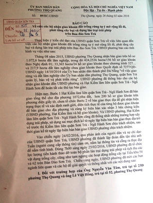 Cũng từ báo cáo của UBND quận Sơn Trà, hai trường hợp này thuộc hộ giao khoán đất trồng rừng trên đất khác, đang trong giai đoạn Hạt Kiểm lâm liên quận Sơn Trà- Ngũ Hành Sơn bàn giao cho UBND phường Thọ Quang quản lý (mới bàn giao trên giấy tờ chứ chưa bàn giao giao trên thực địa). Như vậy, với báo cáo “chỉ phát quang bụi rậm trên đất khác”, UBND quận Sơn Trà đã phủ nhận hoàn toàn thông tin “phá rừng” cũng như hướng xử lý trách nhiệm của lực lượng kiểm lâm và UBND phường Thọ Quang.