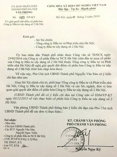 Để thể hiện tính quyết liệt và sự nghiêm túc trong chỉ đạo, công văn đốc thúc lần thứ 2 này của UBND TP Hà Nội cũng ghi rõ: UBND TP Hà Nội đã có ý kiến chỉ đạo tại Công văn số 8384/VP-KT ngày 3/12/2015 về việc thực hiện cổ phần hoá Công ty Đầu tư xây dựng số 2 Hà Nội.