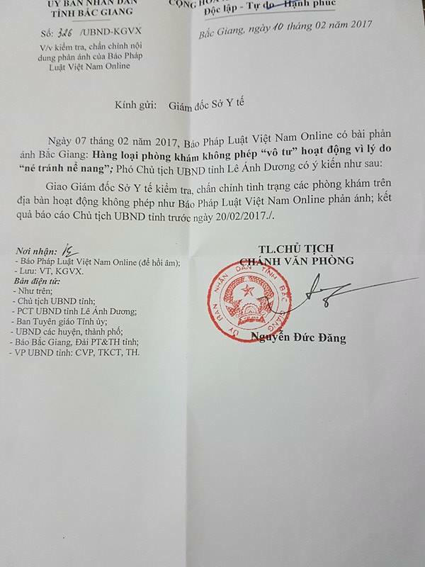 Ngày 7/2/2017 Chánh văn phòng UBND tỉnh Bắc Giang Nguyễn Đức Đăng đã kí công văn số 326/UBND-KGVX về việc kiểm tra thông tin mà báo Pháp luật Việt Nam (PLVN) điện tử phản ánh tình trạng các phòng khám ngoài công lập hoạt động trái phép, đồng thời yêu cầu Sở Ytế Bắc Giang báo cáo kết quả chủ tịch UBND tỉnh trước ngày 20/2/2017
