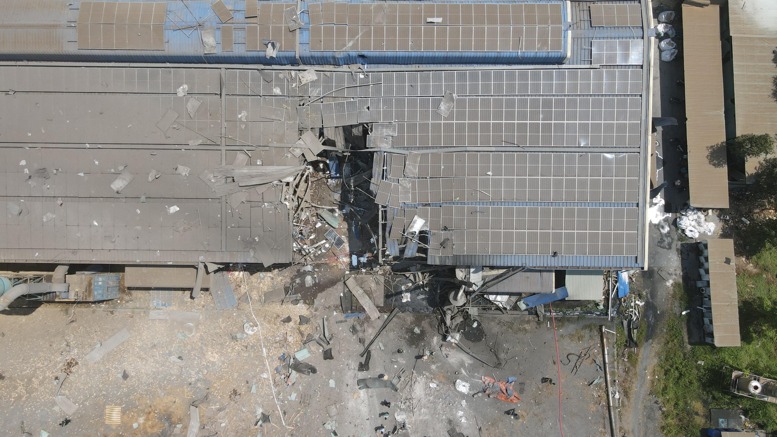 Vụ nổ bình hơi tại khu sản xuất gỗ nhìn từ trên cao. |