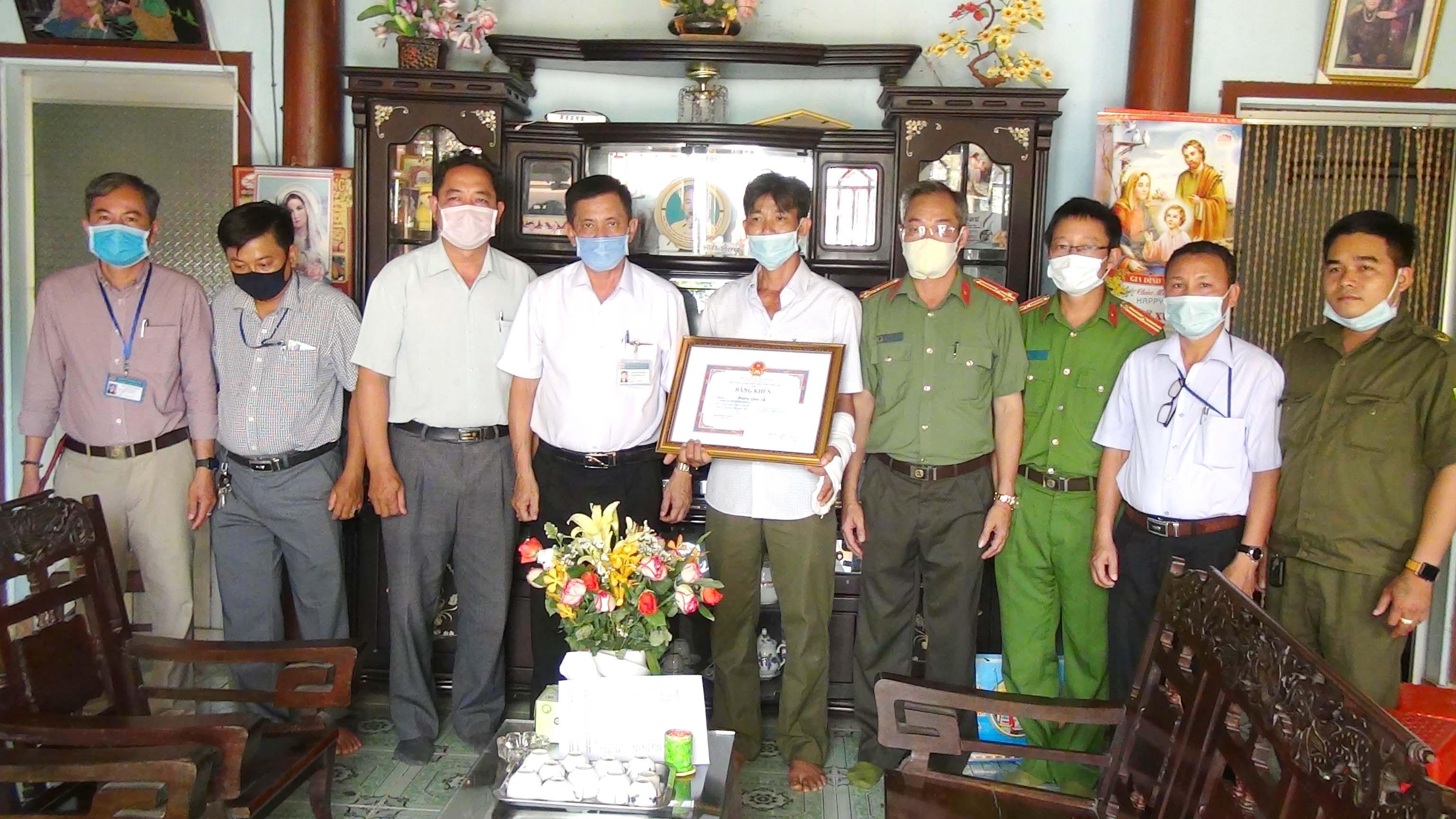 Đại tá Vũ Hồng Văn - Giám đốc Công an tỉnh Đồng Nai đã thay mặt Bộ trưởng Tô Lâm trao Thư khen và số tiền 5 triệu đồng cho đồng chí Hoàng Quốc Sự vì có thành tích không sợ hiểm nguy, dũng cảm tấn công trấn áp tội phạm.