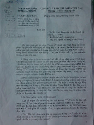 Ngày 14/5/2014, ông Đinh Văn Thu, Phó Chủ tịch UBND tỉnh Quảng Nam ký Công văn số 1747/UBND-KTN về việc hỗ trợ sử dụng xi măng sản xuất trên địa bàn tỉnh để xây dựng các công trình bê tông hóa mặt đường giao thông nông thôn. Công văn này gửi các Sở: Giao thông Vận tải, Kế hoạch và Đầu tư, Tài chính, UBND các huyện, thành phố toàn tỉnh và đặc biệt là gửi Công ty Cổ phần Xi măng Xuân Thành 2 của Tập đoàn Xuân Thành.