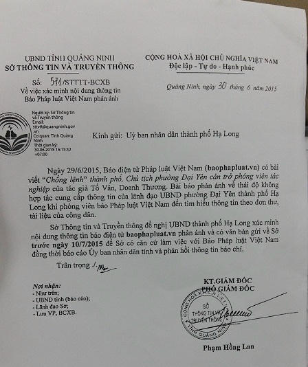 Sở Thông tin truyền thông đề nghị UBND thành phố Hạ Long xác minh thông tin và gửi về Sở Thông tin truyền thông tỉnh Quảng Ninh trước ngày 10/07/2015 để Sở có căn cứ để làm việc với Báo Pháp luật Việt Nam, đồng thời báo cáo UBND tỉnh Quảng Ninh và phản hồi thông tin báo chí.