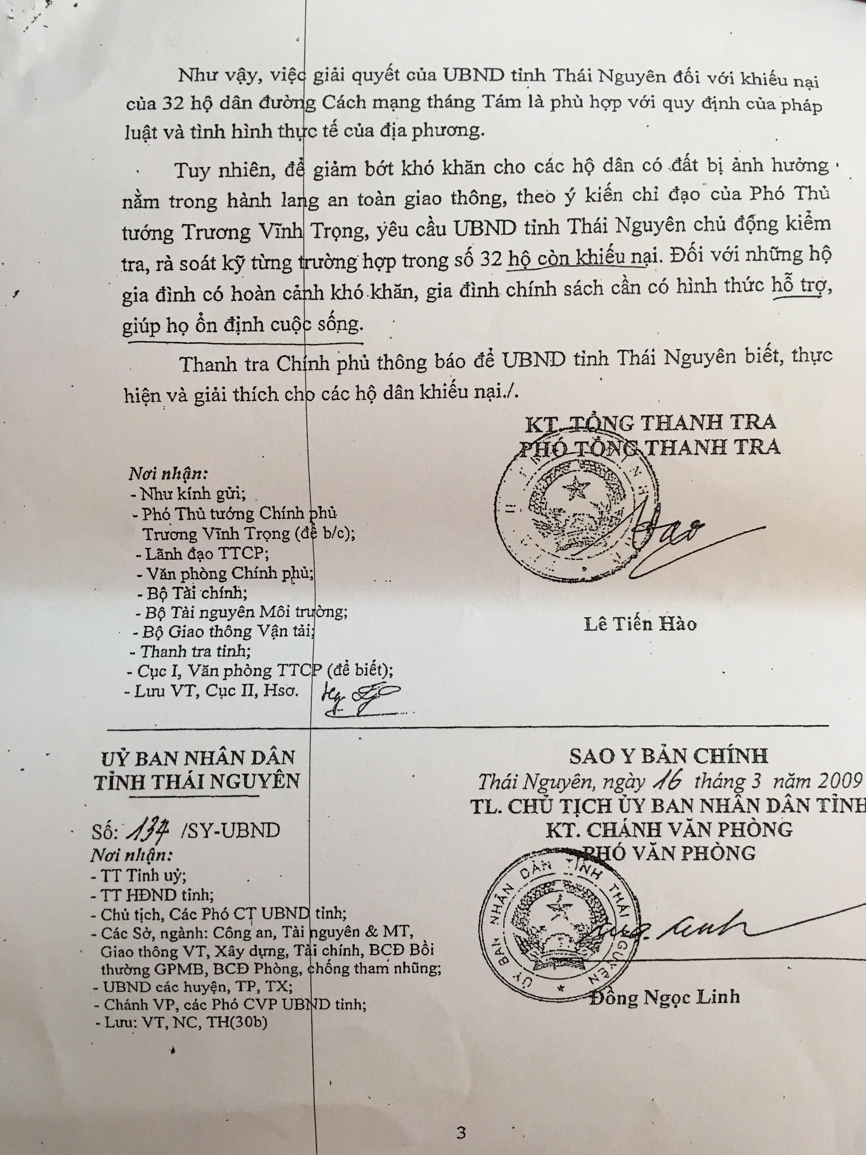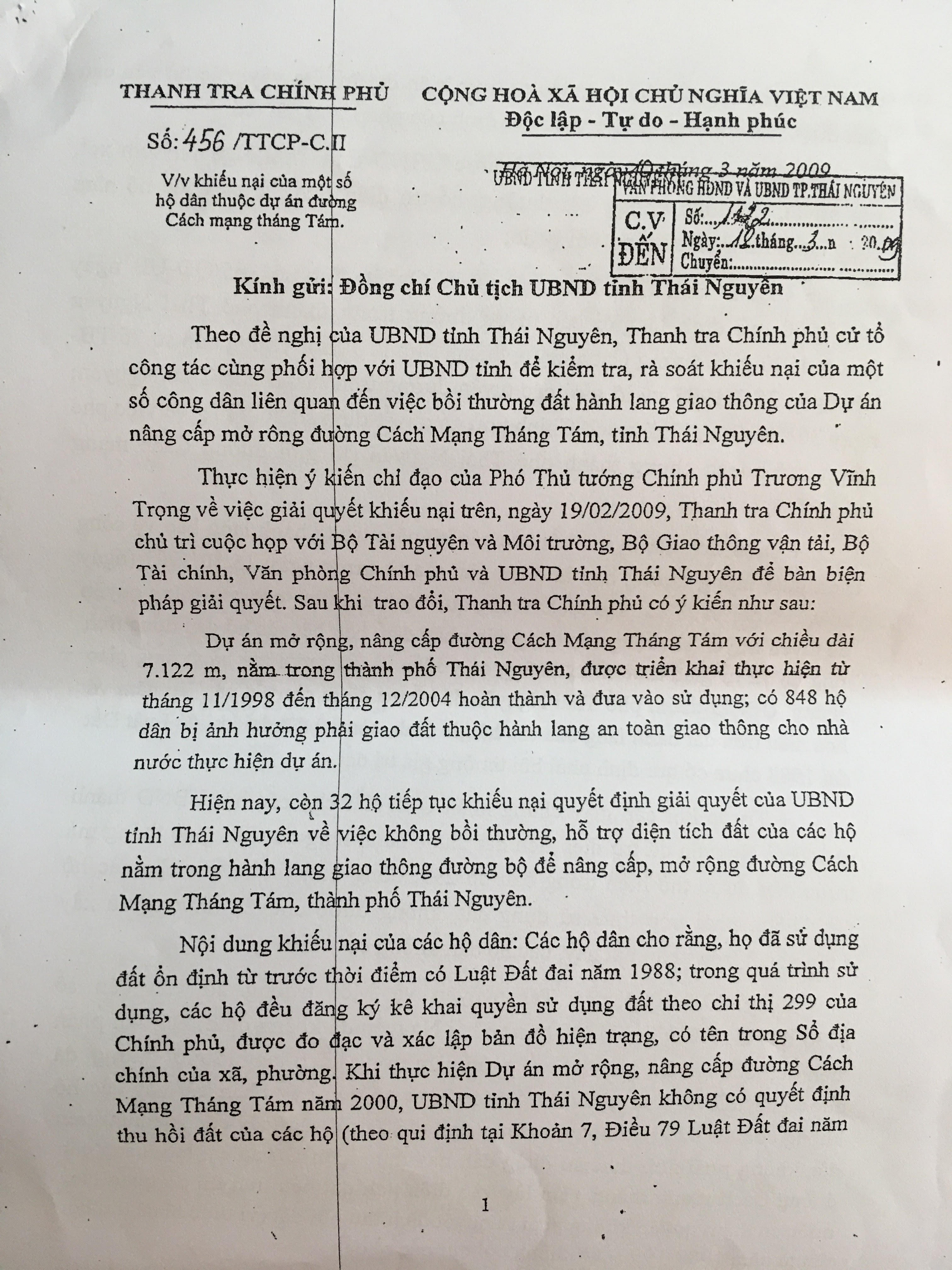 Bộ TN&MT đã có Văn bản số 3836/BTNMT-ĐĐ ngày 29/9/2005 về việc bồi thường đất thuộc hành lang giao thông đã được giải tỏa và Thanh tra Chính phủ có Văn bản số 456/TTCP-CII ngày 10/3/2009 về việc giải quyết khiếu nại của 32 hộ dân thuộc dự án đường Cách Mạng Tháng Tám. Trong đó hoàn toàn đồng tình với cách giải quyết của tỉnh Thái Nguyên và TP Thái Nguyên.