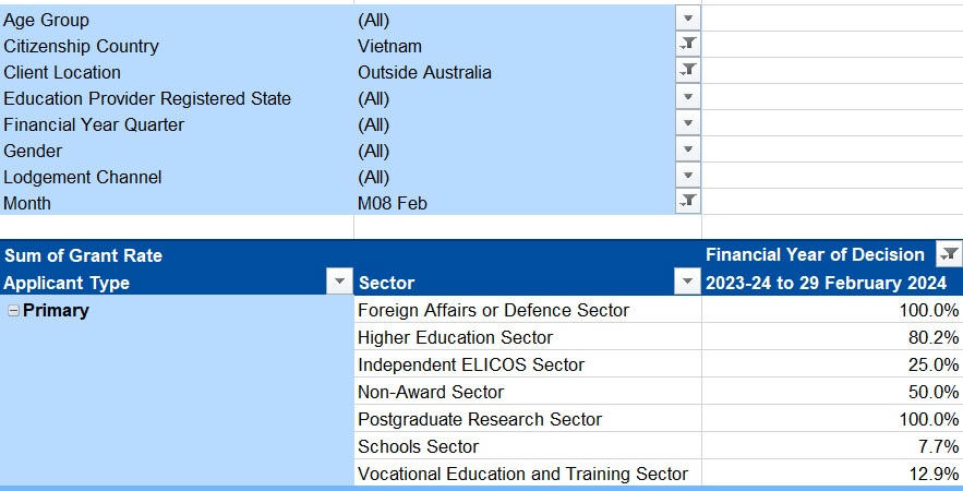 Theo đó, động thái mang tính “thanh lọc” của Bộ di trú Úc để kiểm soát lượng người nhập cư bất hợp pháp đã khiến cho tỉ lệ cấp thị thực của nước này đối với một số quốc gia ở mức “chạm đáy”: Ấn Độ là 19,7%, Philippines là 15,9% và Nepal là 0%). Trong đó, tính đến tháng 2/2024, tỉ lệ hồ sơ được cấp visa với chương trình du học nghề Úc của Việt Nam khá thấp, chỉ khiêm tốn ở con số 12,9%.