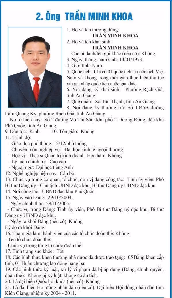 (PLVN) - Ông Trần Minh Khoa, ứng cử viên đại biểu HĐND đặc khu Phú Quốc, tỉnh An Giang nhiệm kỳ 2026-2031, đơn vị bầu cử số 2, hiện đang là Phó Bí thư Đảng ủy, Chủ tịch UBND đặc khu Phú Quốc.