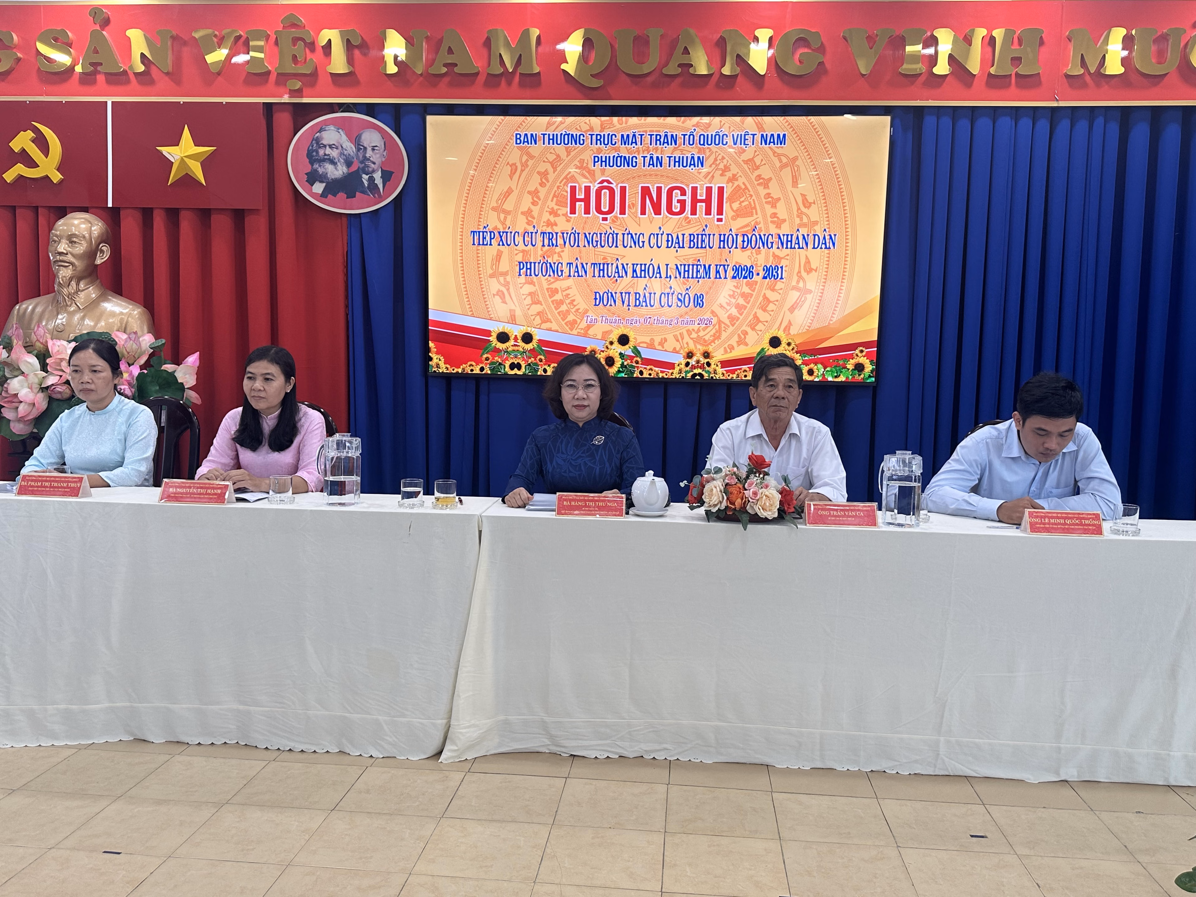 Ngày 7/3, Ban thường trực Ủy ban Mặt trận Tổ quốc (MTTQ) Việt Nam phường Tân Thuận (TPHCM) đã tổ chức hội nghị tiếp xúc giữa cử tri với những người ứng cử đại biểu Hội đồng nhân dân TPHCM khoá XI thuộc đơn vị bầu cử số 3. Hội nghị do ông Nguyễn Văn Phương, Chủ tịch Ủy ban MTTQ Việt Nam phường Tân Thuận chủ trì, với sự tham dự trực tiếp của hơn 100 cử tri tại địa phương.