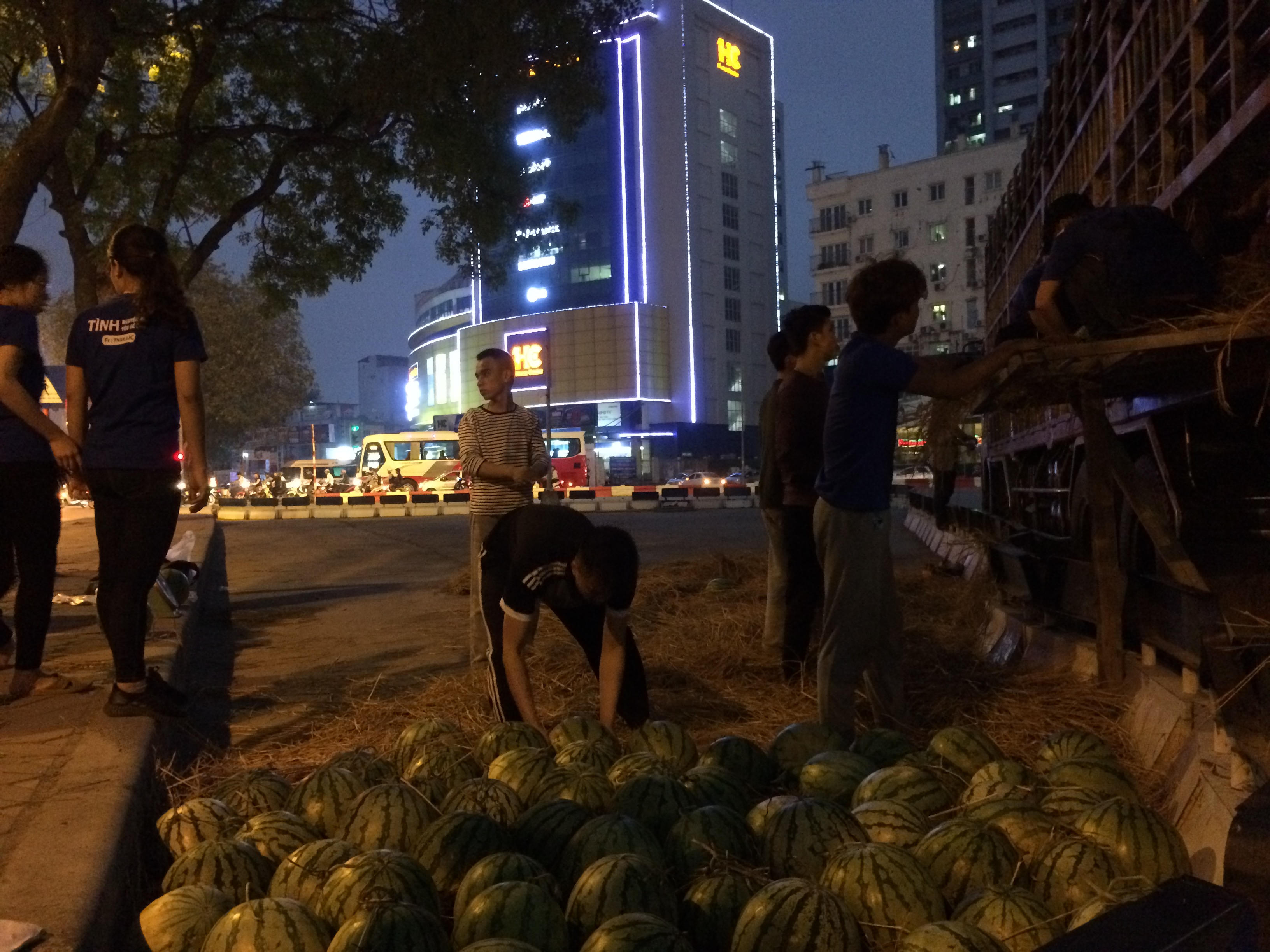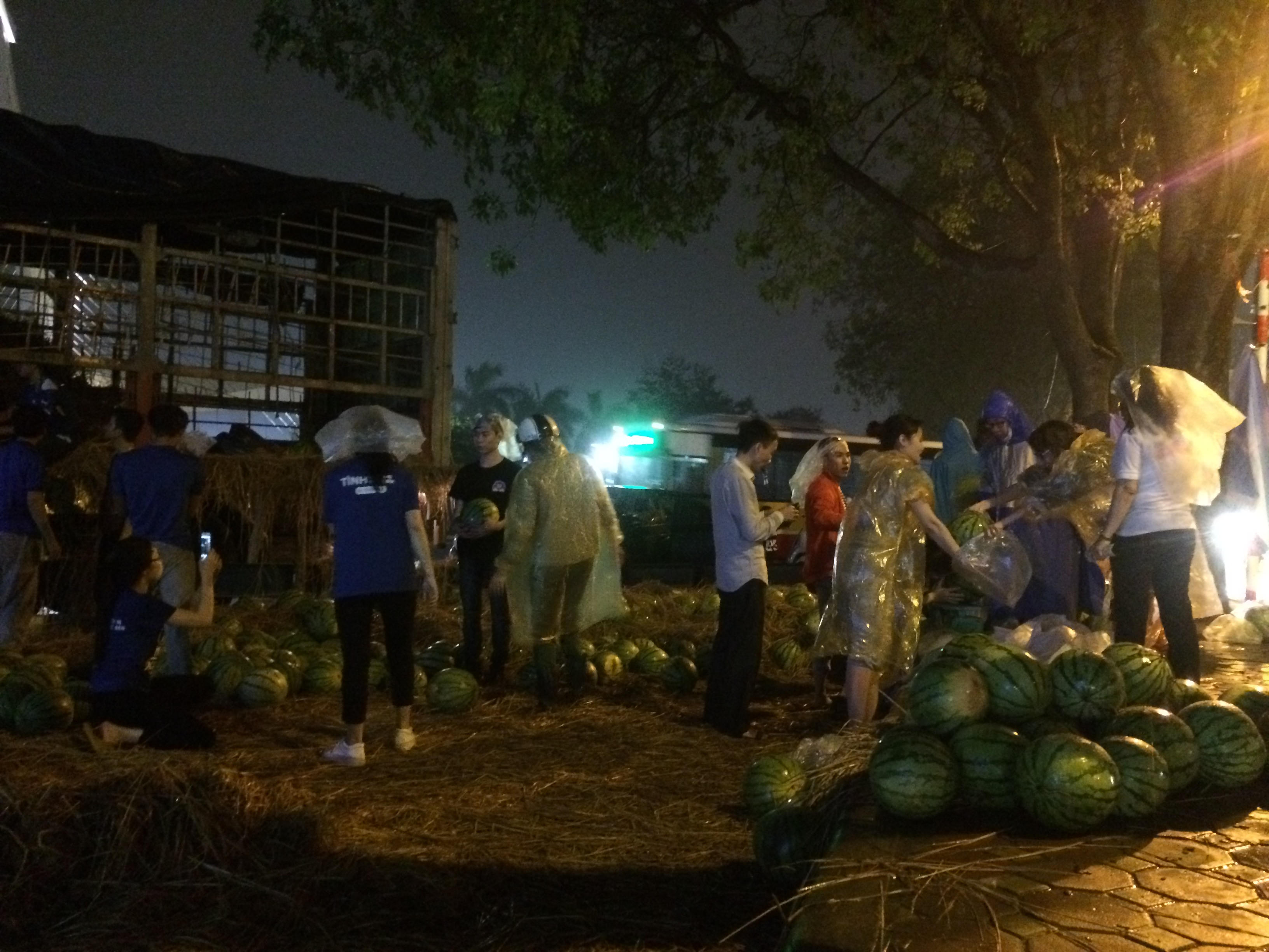 | Dù vất vả nhưng những tình nguyện viên luôn nở nụ cười khi giúp bà con trong chiến dịch “giải cứu” dưa hấu |