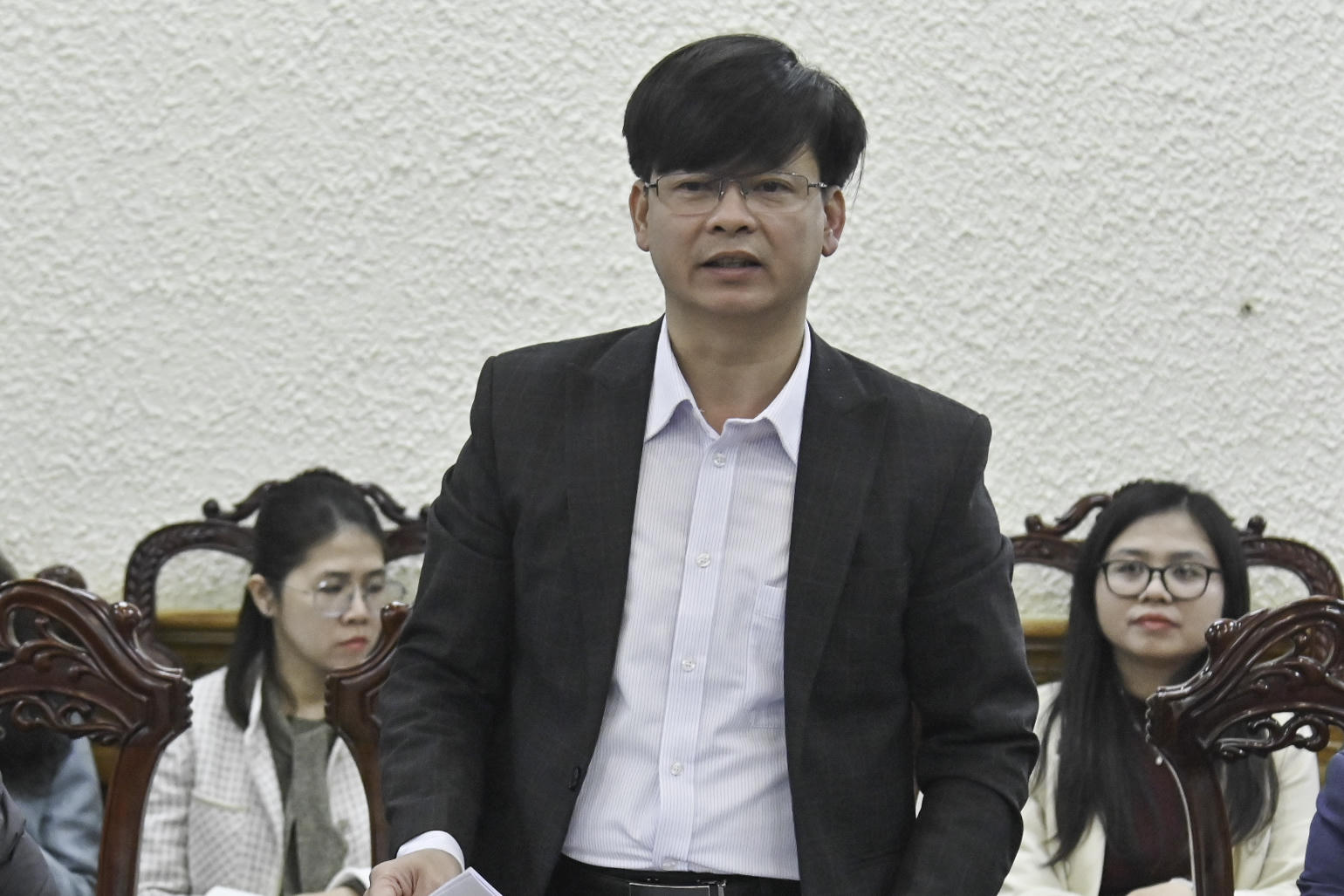 Ông Nguyễn Duy Thắng, Phó Cục trưởng Cục Kiểm tra VBQPPL báo cáo tại buổi làm việc. |