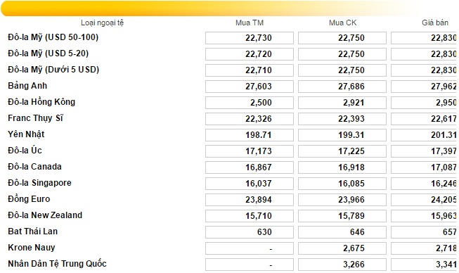 Đồng Euro được niêm yết ở mức: 23.926 đồng (mua) và 24.212 (bán). Bảng Anh: 27.520 đồng (mua) và 27.961 (bán). Yên Nhật được mua vào ở mức 197,4 đồng và bán ra ở mức 201,2 đồng.