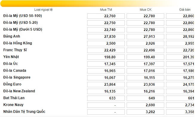 Đa số các ngân hàng giữ nguyên giá mua bán USD: 22.760 đồng (mua) và 22.840 đồng (bán). Vietcombank, Vietinbank, BIDV đều niêm yết ở quanh mức này. Một số NH nhỏ hơn niêm yết giá bán ra cao hơn, cơ nơi lên tới 22.860 đồng/USD.