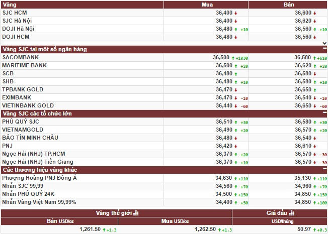 Mở cửa lúc 8h30 sáng 23/5, giá vàng miếng trong nước được Tập Đoàn Vàng bạc đá quý DOJI niêm yết ở mức: 36,50 triệu đồng/lượng (mua vào) và 36,58 triệu đồng/lượng (bán ra), tăng 30 ngàn đồng ở cả 2 chiều mua vào và bán ra so với so với chiều qua.
