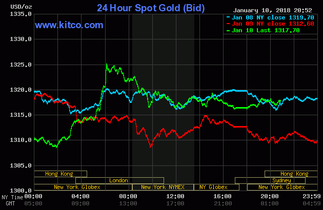 Tới đầu giờ sáng 11/1 (giờ Việt Nam), giá vàng thế giới giao ngay đứng ở mức 1.322 USD/ounce. Giá vàng giao tháng 2 trên sàn Comex New York đứng ở mức 1.323,2 USD/ounce.