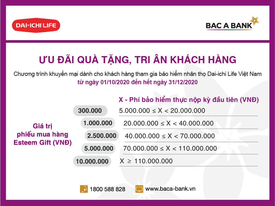 Trên nền tảng quan hệ đối tác chiến lược với mục tiêu tối ưu hoá lợi ích khách hàng, Ngân hàng TMCP Bắc Á (BAC A BANK) và Dai-ichi Life Việt Nam phối hợp triển khai Chương trình khuyến mại “Ưu đãi quà tặng, Tri ân khách hàng” từ ngày 01/10/2020 đến hết ngày 31/12/2020. Trong thời gian này, các khách hàng ký mới hợp đồng bảo hiểm nhân thọ sẽ nhận được phần quà hấp dẫn tương ứng với mức phí bảo hiểm thực nộp kỳ đầu tiên (tối thiểu 5 triệu đồng).