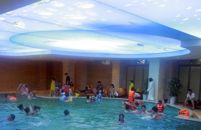 | Tọa lạc ngay cạnh khu Spa, bể bơi bốn mùa trong nhà đưa du khách vào không gian đầy thư thái. Hình ảnh đại dương sống động phản chiếu xuống làn nước xanh, tạo ra những hình ảnh lung linh hút mắt |