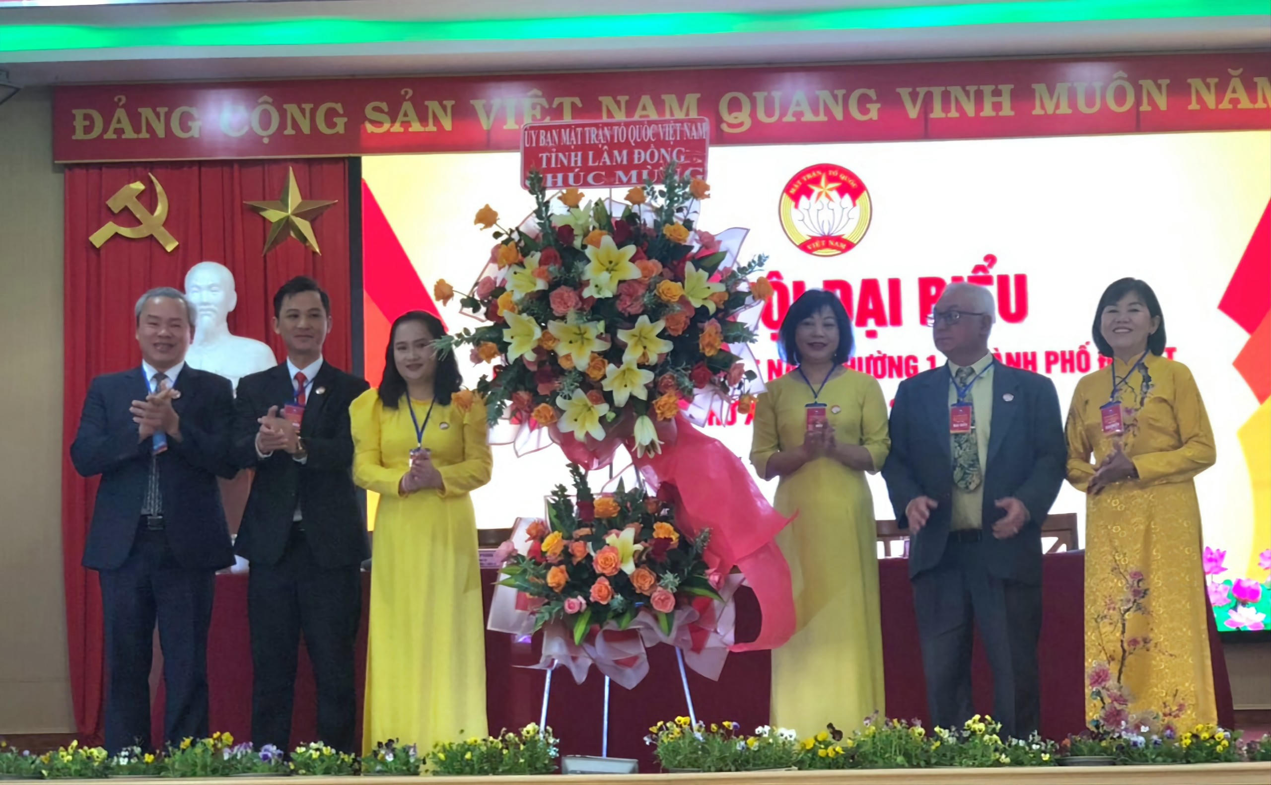 Lãnh đạo Ủy ban MTTQ Việt Nam tỉnh Lâm Đồng, Ủy ban MTTQ Việt Nam TP Đà Lạt và phường 1 tặng hoa chúc mừng Ủy ban MTTQ Việt Nam phường 1 nhiệm kỳ 2024- 2029 và đại biểu đi dự Đại hội cấp trên. |