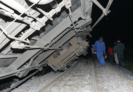 (PLO) - Sau khi va chạm với xe container, đầu tàu chở khách và hai toa khác đã "bắn" khỏi đường ray. Tài xế lái tàu và lái xe ôtô thị thương, hàng trăm hành khách hoảng loạn.
