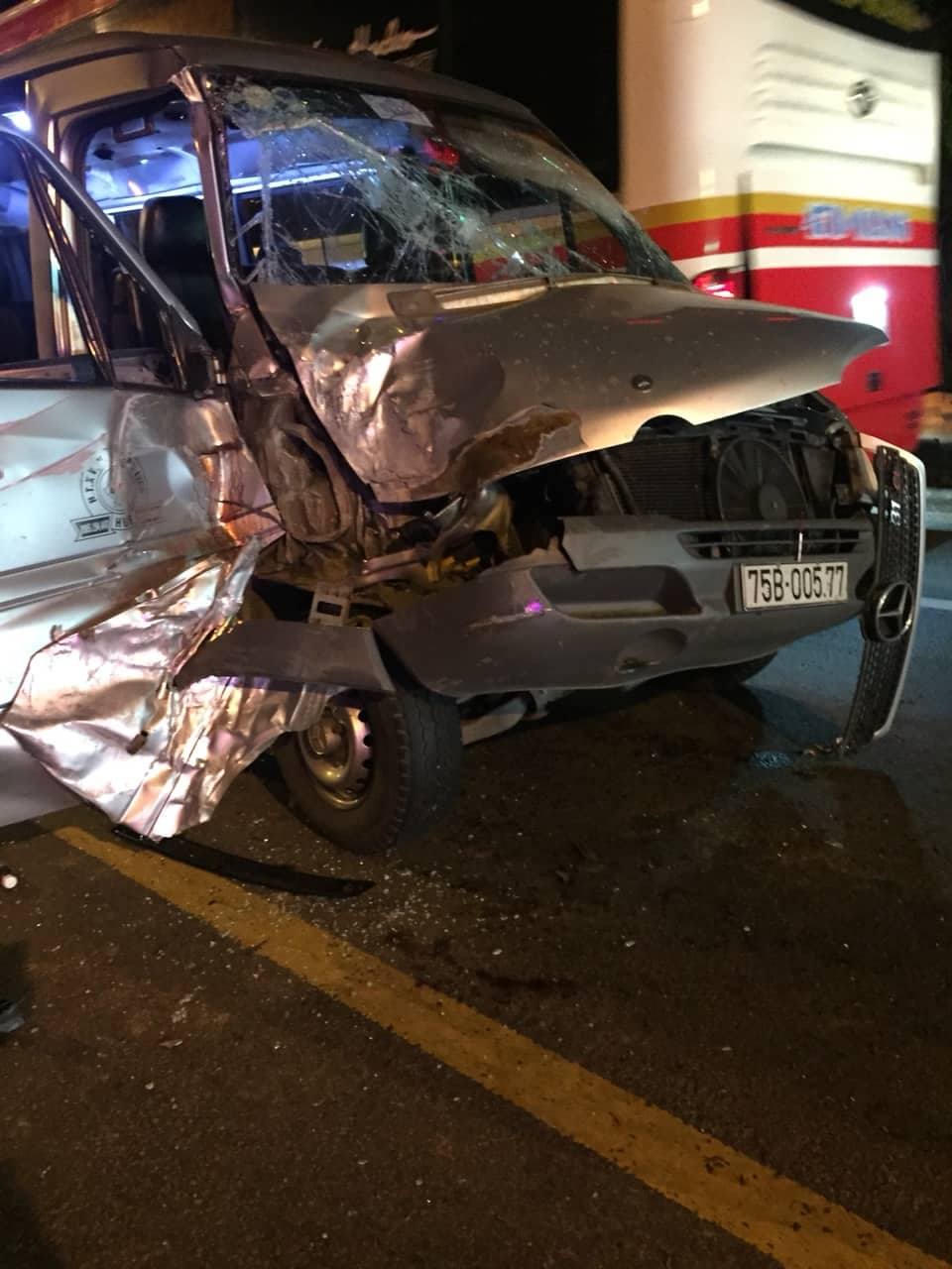 Theo đó, xe khách 16 chỗ BKS 75B-005.77 do tài xế Huỳnh Văn Cườm (SN 1988) điều khiển đã va chạm với xe tải BKS 37C-261.97 do tài xế Phan Văn Thế (SN 1985) điều khiển. Vụ tai nạn khiến ít nhất 4 người trên xe khách bị thương, trong đó có 1 người bị thương rất nặng. Tại hiện trường, chiếc xe khách bị hỏng nặng, nát bét phần đầu.