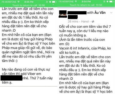 Chủ nhân một trang facebook là thành viên của hội các bà mẹ đang nuôi con nhỏ đăng dòng quảng cáo: “Lần trước em đặt về tiêm cho con em, nhiều mẹ đặt quá nên lần này em đặt dư được một liều (vắc-xin 6in1 của Pháp) thôi. Không có nhiều đâu ạ. Em không thích xếp hàng đặt tiêm nên đặt về cho nhanh.