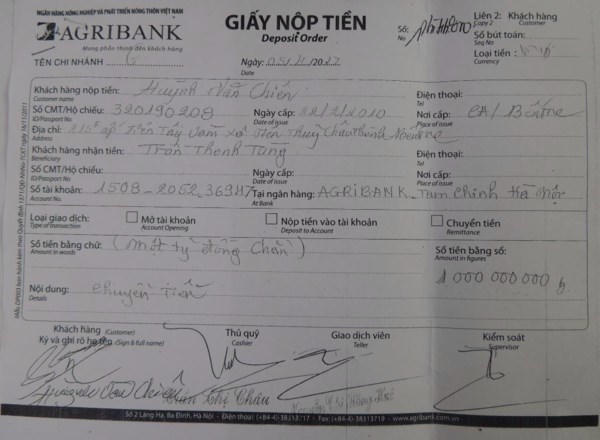 | Phiếu chuyển 1 tỉ đồng của ông Chiên vào tài khoản Ngân hàng Agribank mang tên Trần Thanh Tùng. Ảnh T.PHÚC |