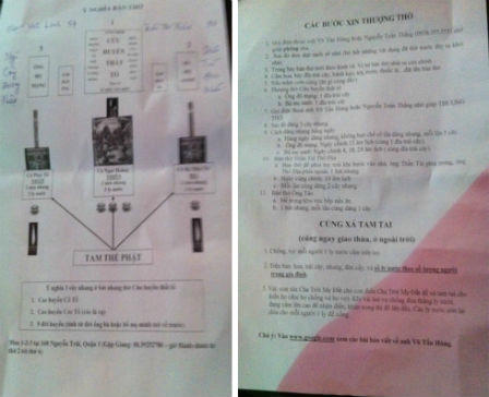 Và đến đây, mục đích của chúng đã lộ ra. Người bệnh được chỉ đến một địa chỉ trên đường Nguyễn Trãi gặp người tên Giang để mua ba tấm bài “Cửu thiên huyền nữ, ông độ mạng, bà mẹ sanh” để về thờ tự. Như vậy, chúng chỉ mạo danh “chữa bệnh không lấy tiền” là để cấu kết với một số đối tượng khác “móc túi” người bệnh bằng cách mua đồ.