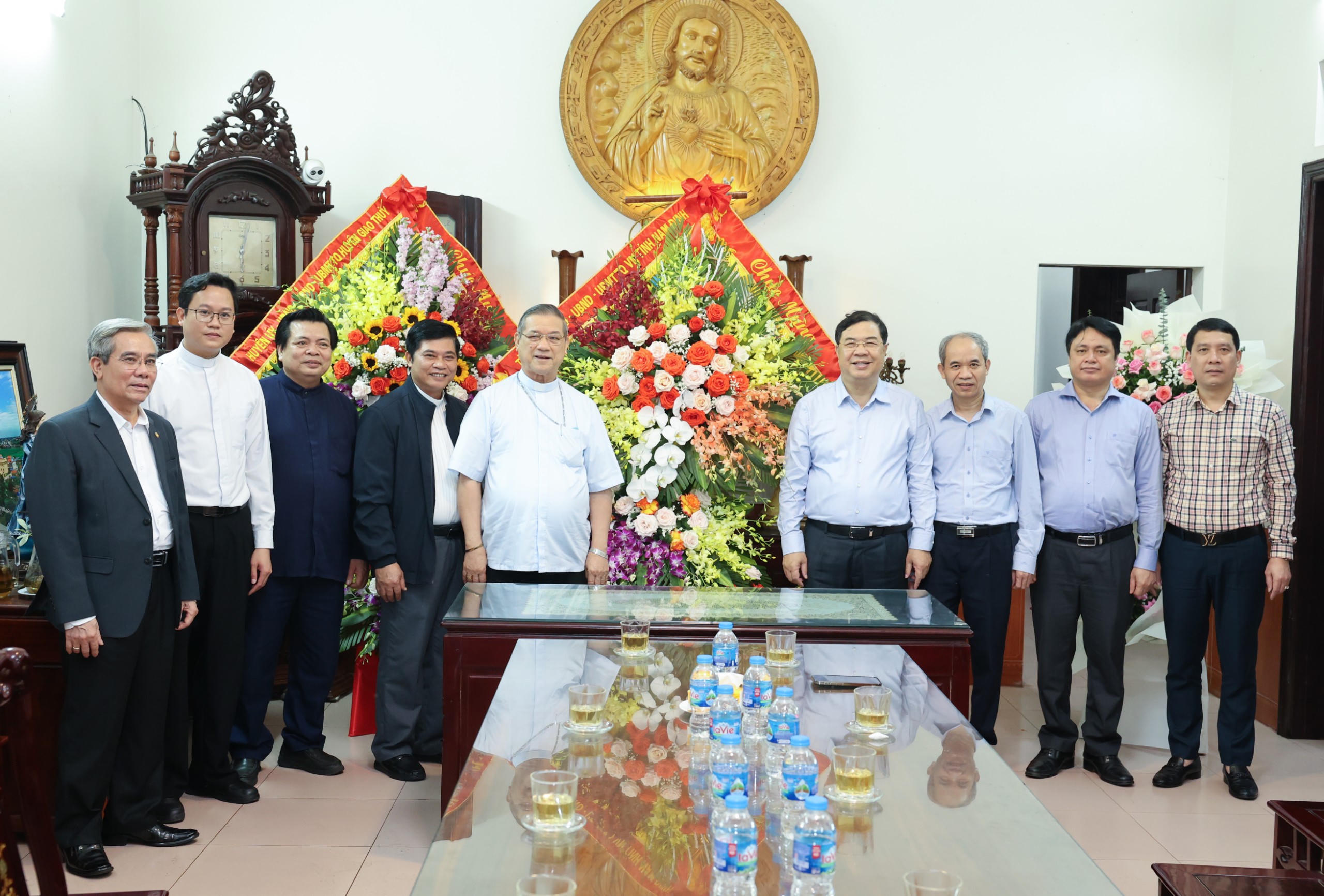 Bí thư Tỉnh ủy Phạm Gia Túc cùng lãnh đạo MTTQ tỉnh, Ban Dân vận, Công an tỉnh chúc mừng Giám mục Giáo phận Bùi Chu Tôma Vũ Đình Hiệu. (Ảnh: Viết Dư) |