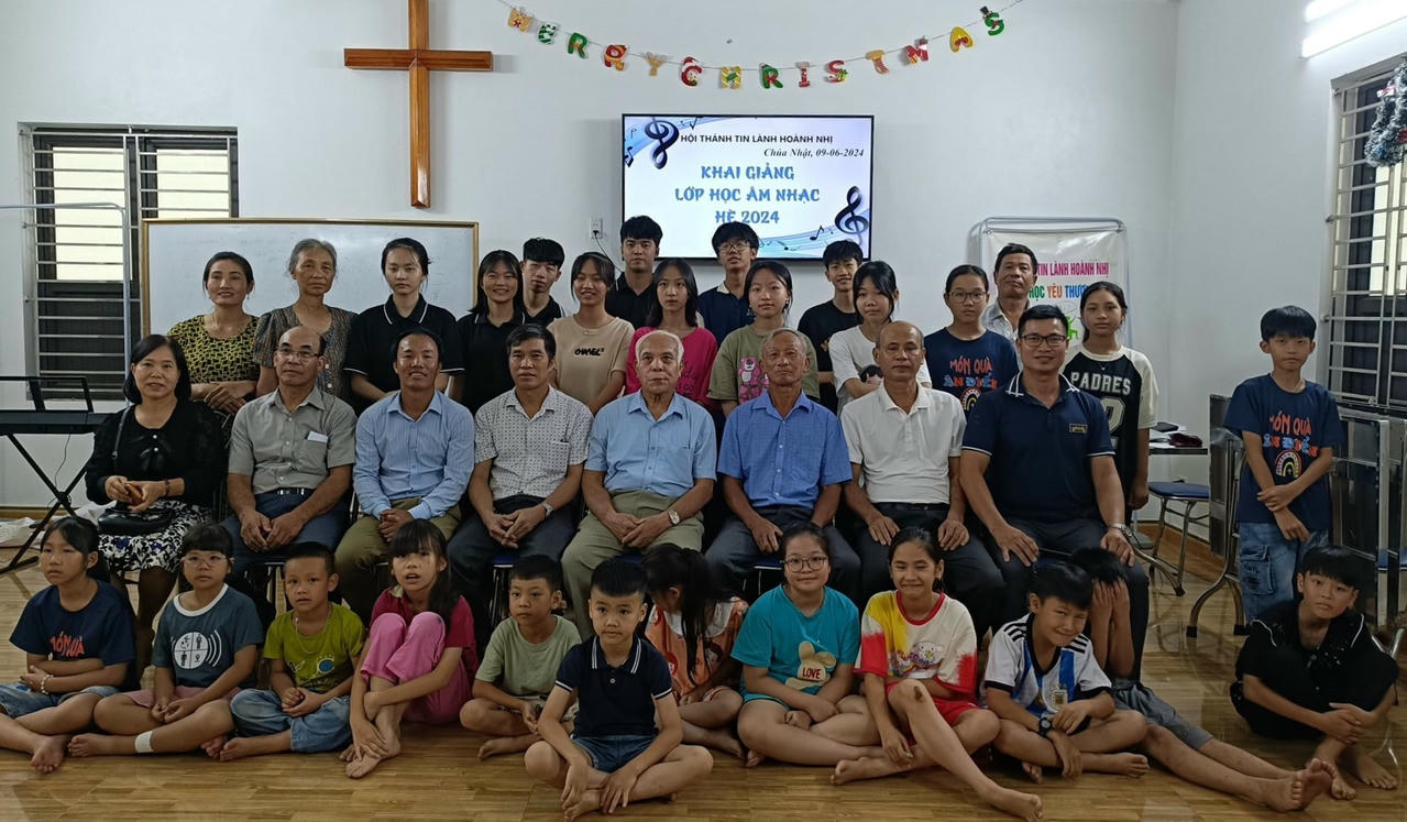 Mục sư Nguyễn Ngọc Thành (người ngồi thứ 3, hàng thứ 2 từ trái qua) chụp cùng các thầy giáo và các em học sinh nhân buổi khai giảng lớp Âm nhạc hè 2024 tại Hội Thánh Tin Lành Hoành Nhị. (Ảnh: NVCC). |