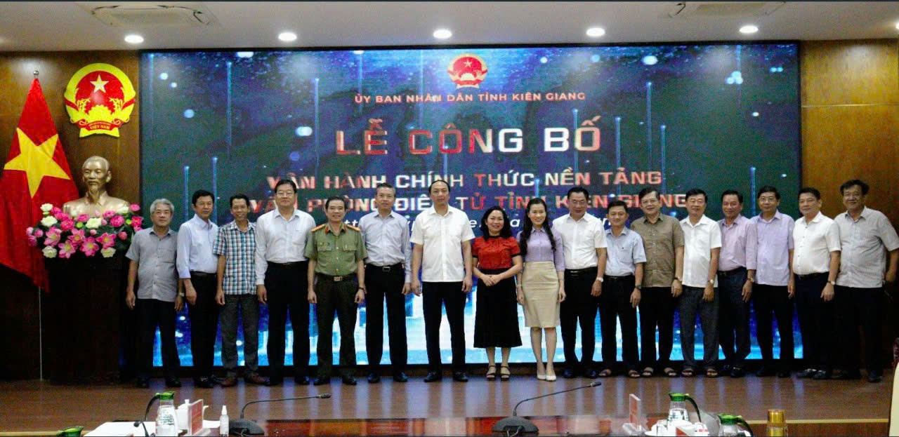Cũng tại buổi lễ công bố, Chủ tịch UBND tỉnh Kiên Giang Lâm Minh Thành, Phó Chủ tịch UBND tỉnh Kiên Giang Nguyễn Lưu Trung cùng đại diện lãnh đạo một số sở, ngành đã ấn nút công bố vận hành Nền tảng Văn phòng điện tử tỉnh Kiên Giang.