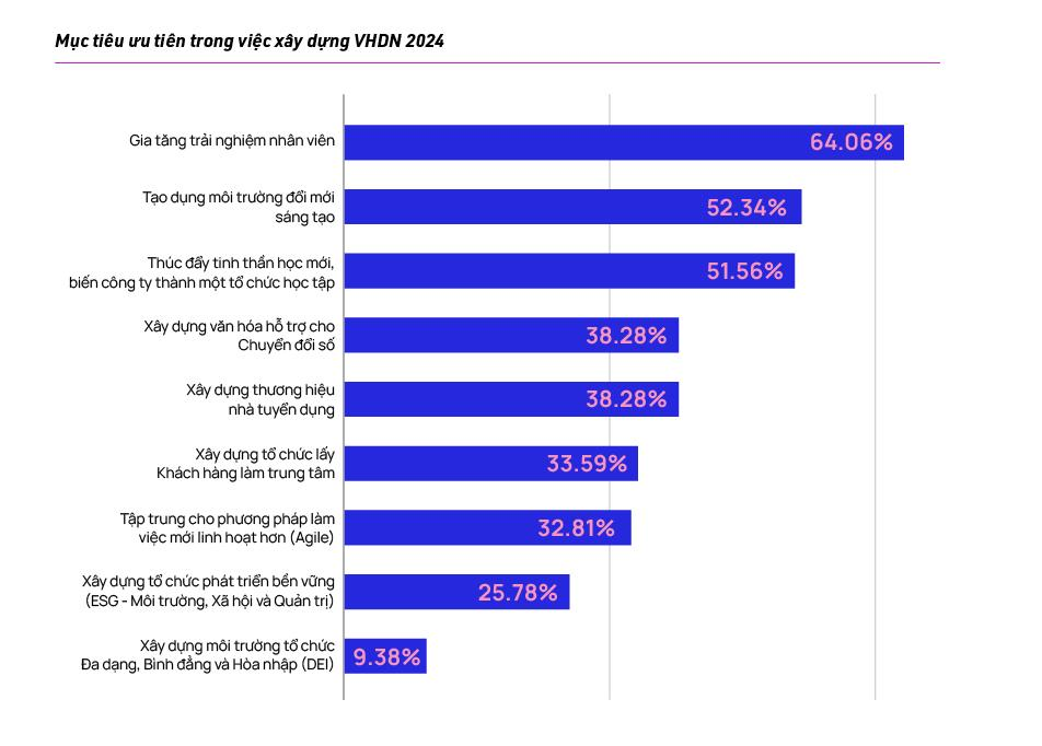 Bên cạnh đó, kết quả khảo sát cho thấy, Gia tăng trải nghiệm nhân viên, Tạo dựng môi trường đổi mới sáng tạo, Xây dựng tổ chức học tập sẽ là 3 xu hướng chính dẫn dắt VH DN trong năm 2024.
