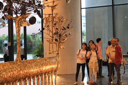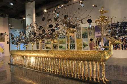 Trong ngôi nhà nghệ thuật, trưng bày hàng trăm bức tranh về cầu Long Biên và tác phẩm độc đáo "những con mắt nguyên thủy" đã thu hút được sự chú ý đông đảo từ phía giới trẻ đến các nhà nghiên cứu. Tác phẩm “Những con mắt nguyên thủy” của nhà điêu khắc Nguyễn Đức Quý.