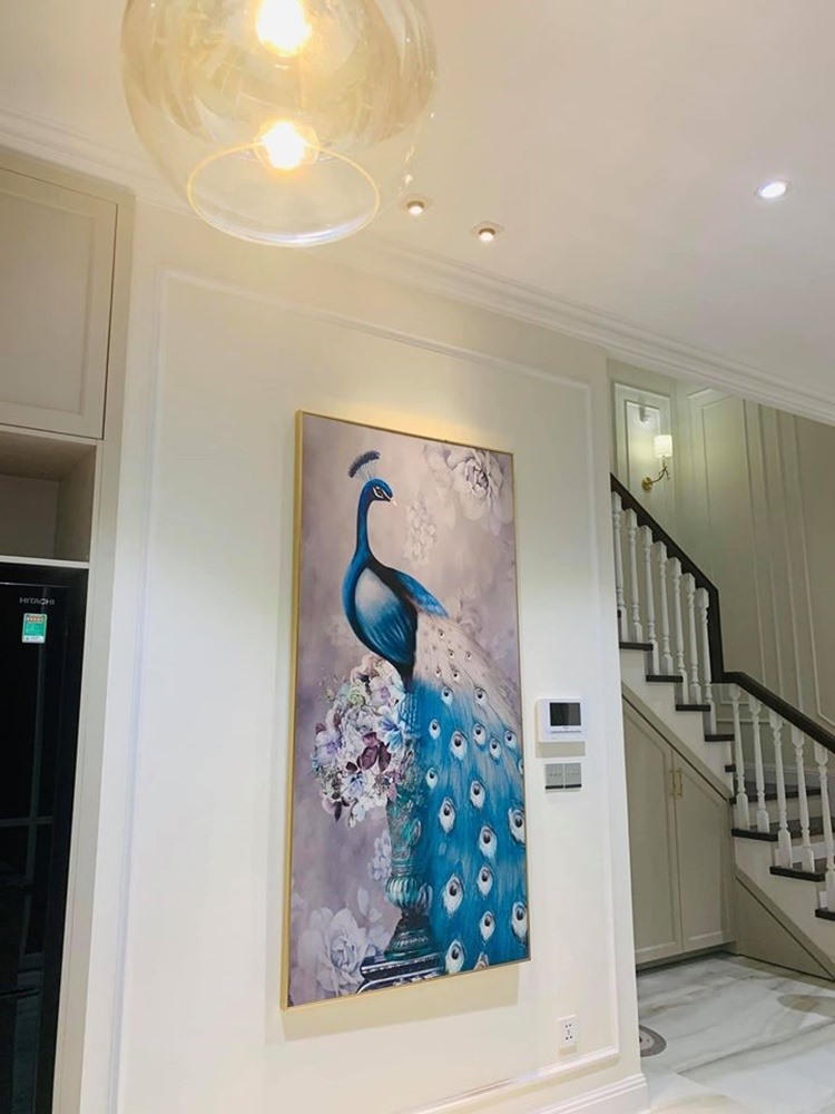 Vốn là người lãng mạn nên Thanh Vân Hugo thường mua hoa tươi về cắm, trang hoàng cho tổ ấm nhỏ. Bức tranh chim công là bức Vân Hugo yêu thích được đặt ở giữa phòng khách, bên cạnh lối dẫn lên cầu thang.