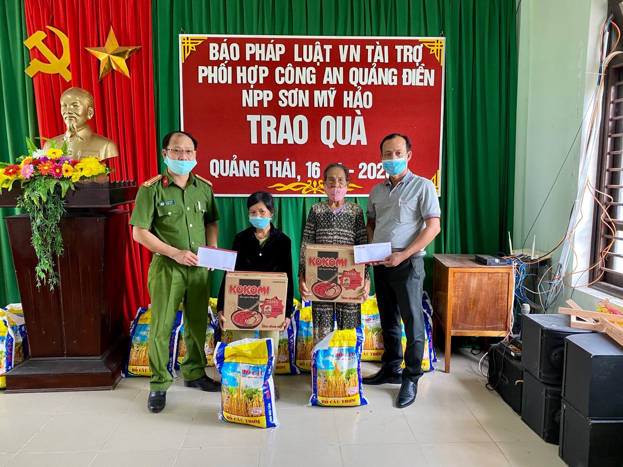 (PLVN) - Nhằm góp phần chia sẻ với đồng bào có hoàn cảnh khó khăn bị ảnh hưởng dịch covid-19. Chiều nay (16/4), VP báo PLVN Khu vực Bình Trị Thiên phối hợp cùng công an huyện Quảng Điền và nhà phân phối sơn Mỹ Hảo (420 Lê Duẩn, TP Huế) trao 50 suất quà cho người dân nghèo tại xã Quảng Phước và xã Quảng Thái (huyện Quảng Điền, Thừa Thiên – Huế). Mỗi suất quà trị giá 250 nghìn đồng.