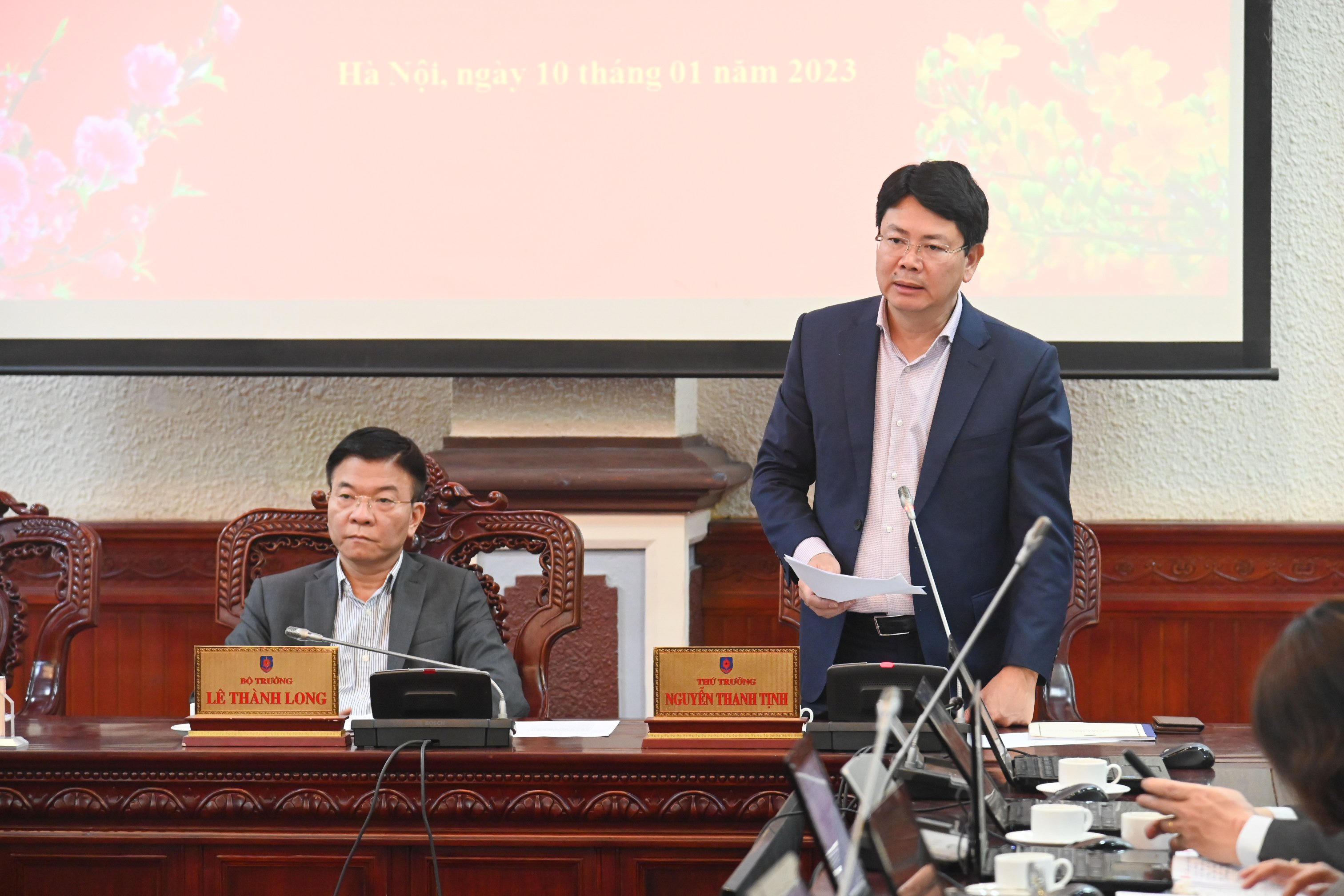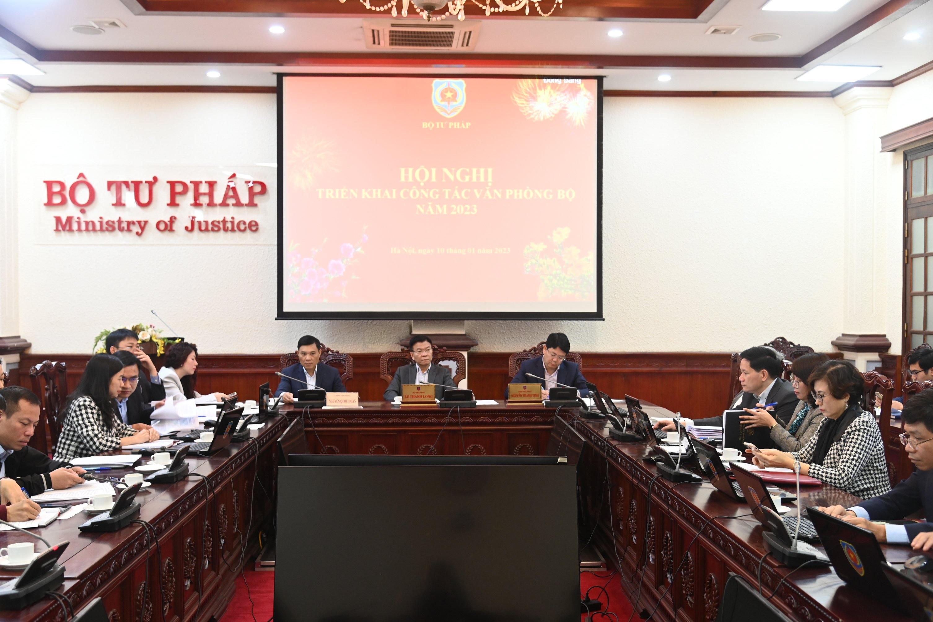 (PLVN) - Ngày 10/1, Bộ Tư pháp tổ chức Hội nghị triển khai công tác Văn phòng năm 2023. Đến dự và phát biểu chỉ đạo Hội nghị có Bộ trưởng Lê Thành Long, cùng tham dự có Thứ trưởng Nguyễn Thanh Tịnh và đại diện lãnh đạo một số đơn vị thuộc Bộ.