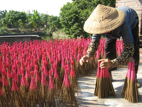 Cả thôn làm hương nên nhà nào cũng tận dụng khoảng sân nhỏ trước nhà để phơi hương. Nhìn từ trên cao như một bức tranh lớn được bài trí họa tiết, hoa văn - những bông “hoa hương” với màu sắc bắt mắt. Đó là màu của những nén hương đang được đem phơi nắng, là màu hồng của những bó tăm hương được nhuộm từ các loại lá tự nhiên, màu sân gạch cũ kỹ rêu phong, màu vàng rơm của thân hương rồi màu nâu của những nguyên liệu đang được phơi khô chờ cán nhỏ làm bột hương...