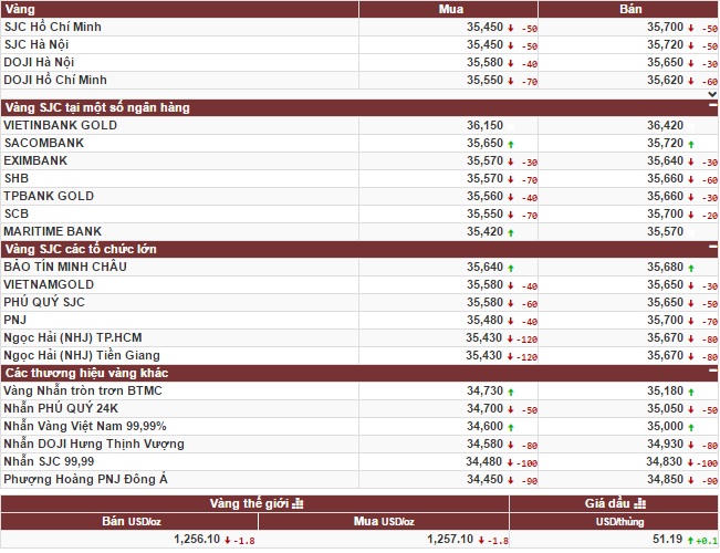 Cụ thể, giá vàng SJC trên hệ thống của SJC tại TP. HCM sáng nay đã lao dốc giảm mạnh 50 nghìn đồng hai chiều về 35,45-35,70 triệu đồng/lượng. Chênh lệch giữa giá mua vào và bán ra ở mức 250 nghìn đồng.