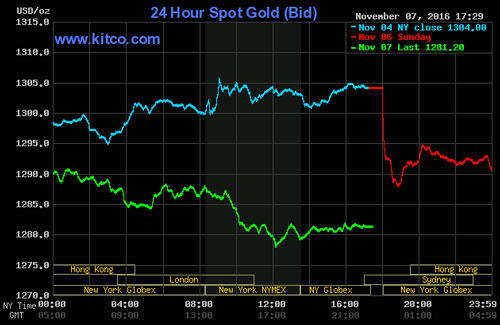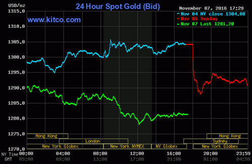 (PLO) - Giá vàng tiếp tục giảm sau cú gãy nhịp chiều qua do giới đầu tư đồng loạt quay sang các loại tài sản có độ rủi ro cao hơn. Kết luận của FBI đã làm thay đổi tỷ lệ người Mỹ ủng hộ cho bà Clinton vào nhà Trắng tăng hơn 3% so với trước đó, nhưng nó cũng làm thị trường vàng bị đảo lộn giá. Tuy nhiên, vẫn còn đó một sự bất ngờ có thể làm rúng động các thị trường.