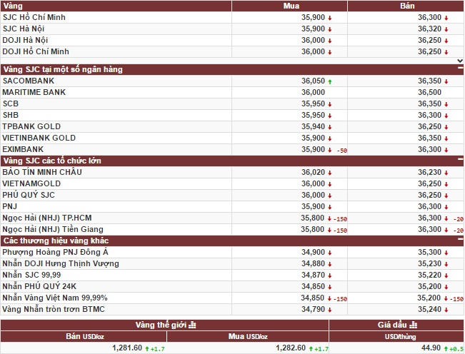 Tập Đoàn Vàng bạc đá quý DOJI niêm yết giá vàng SJC ở mức: 36,00 triệu đồng/lượng (mua vào) và 36,25 triệu đồng/lượng (bán ra). Công ty vàng bạc đá quý Sài Gòn niêm yết vàng SJC ở mức: 35,90 triệu đồng/lượng (mua vào) và 36,32 triệu đồng/lượng (bán ra).